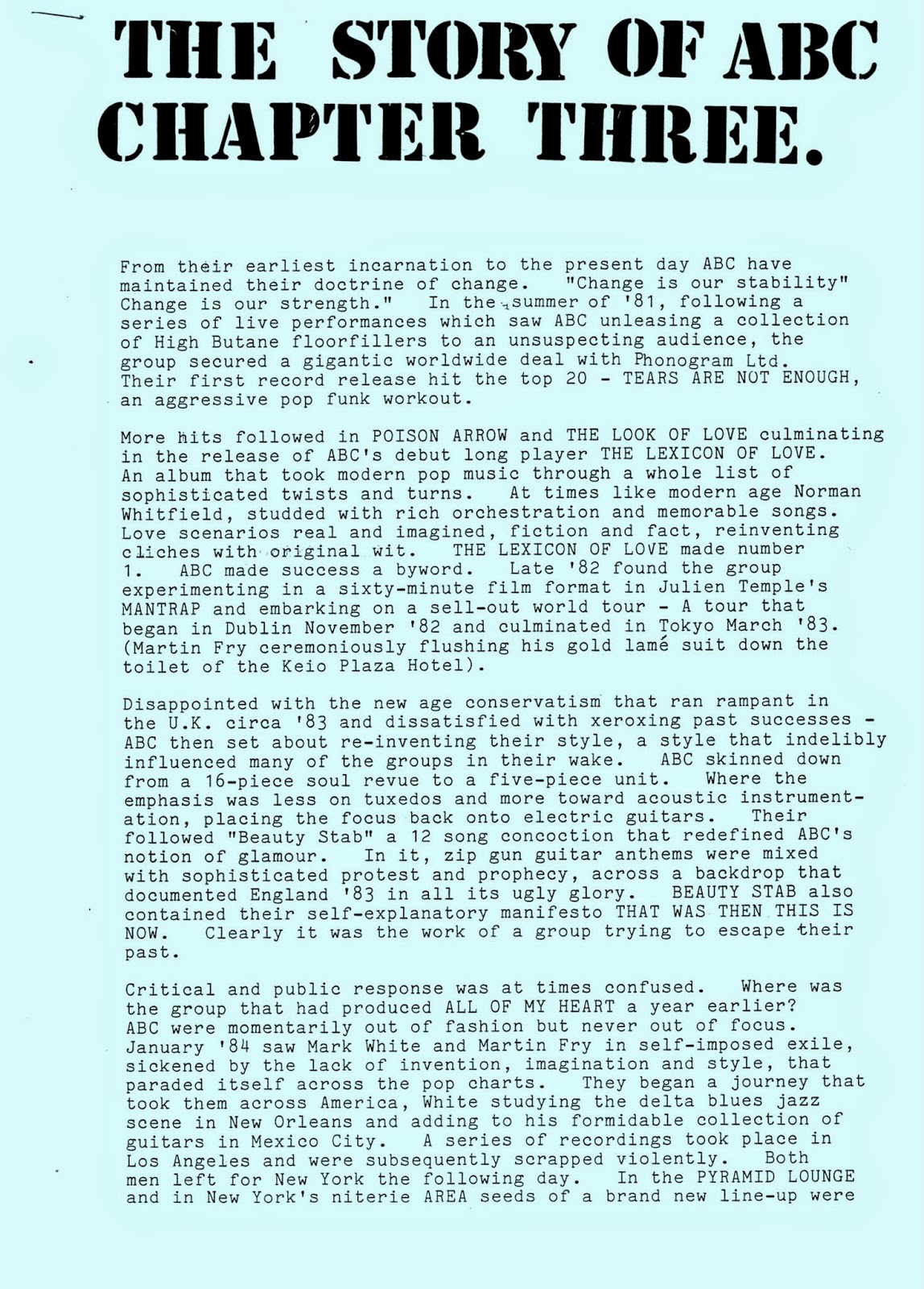 Check out my ABC fansite "Lexicon Of ABC Martin Fry" - you'll find our daily section at